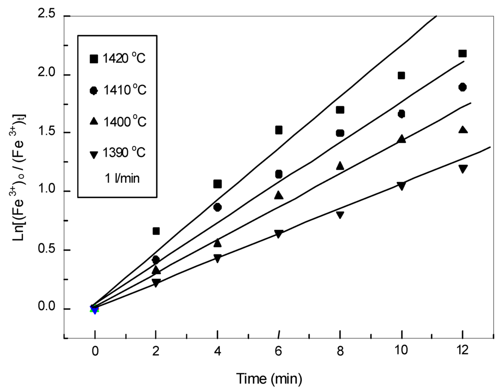 3.3.3. Oxidation Kinetics of Iron in the Slag