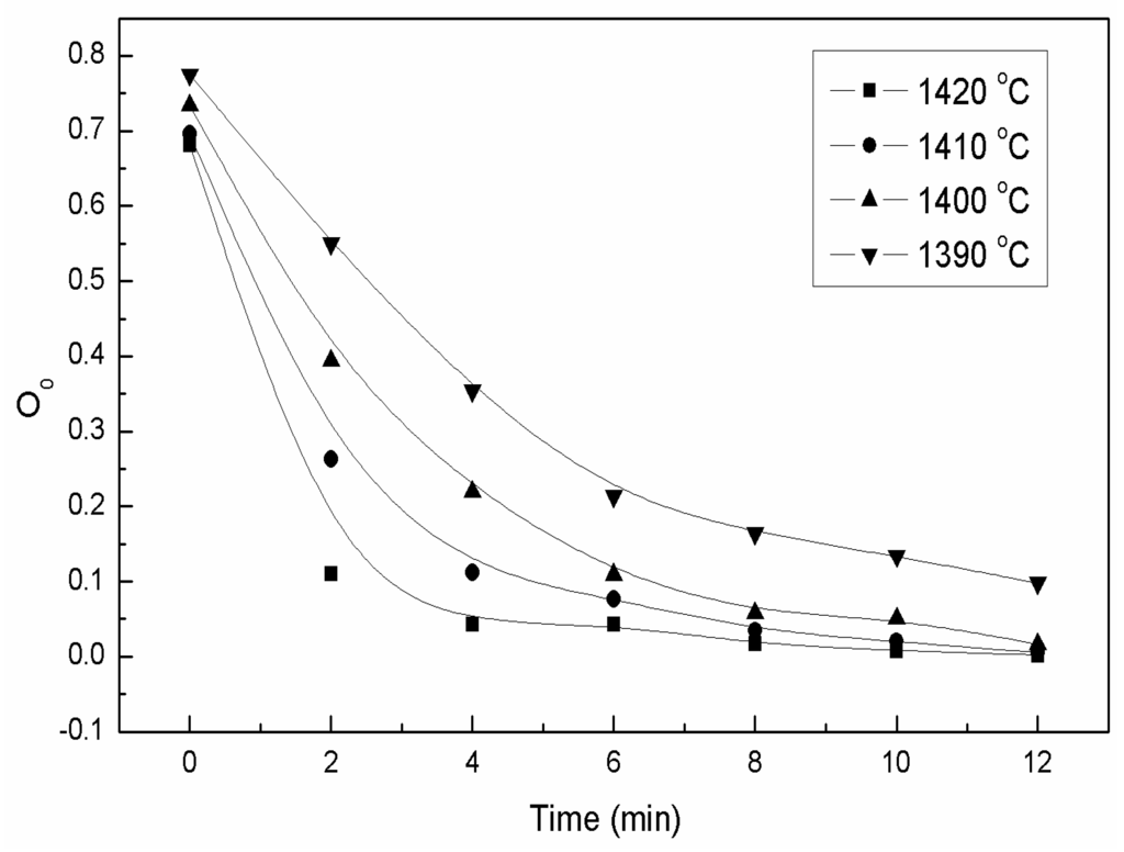 where, xFeO is the activity coefficient of FeO. It is evident that the oxygen capacity of the slag decreases with increasing oxidation time and temperature (Figure 13). This means, the reducing substance decreases with increasing oxidation time and temperature. However, the oxygen capacity of the slag remains constant when the system eventually reaches equilibrium.