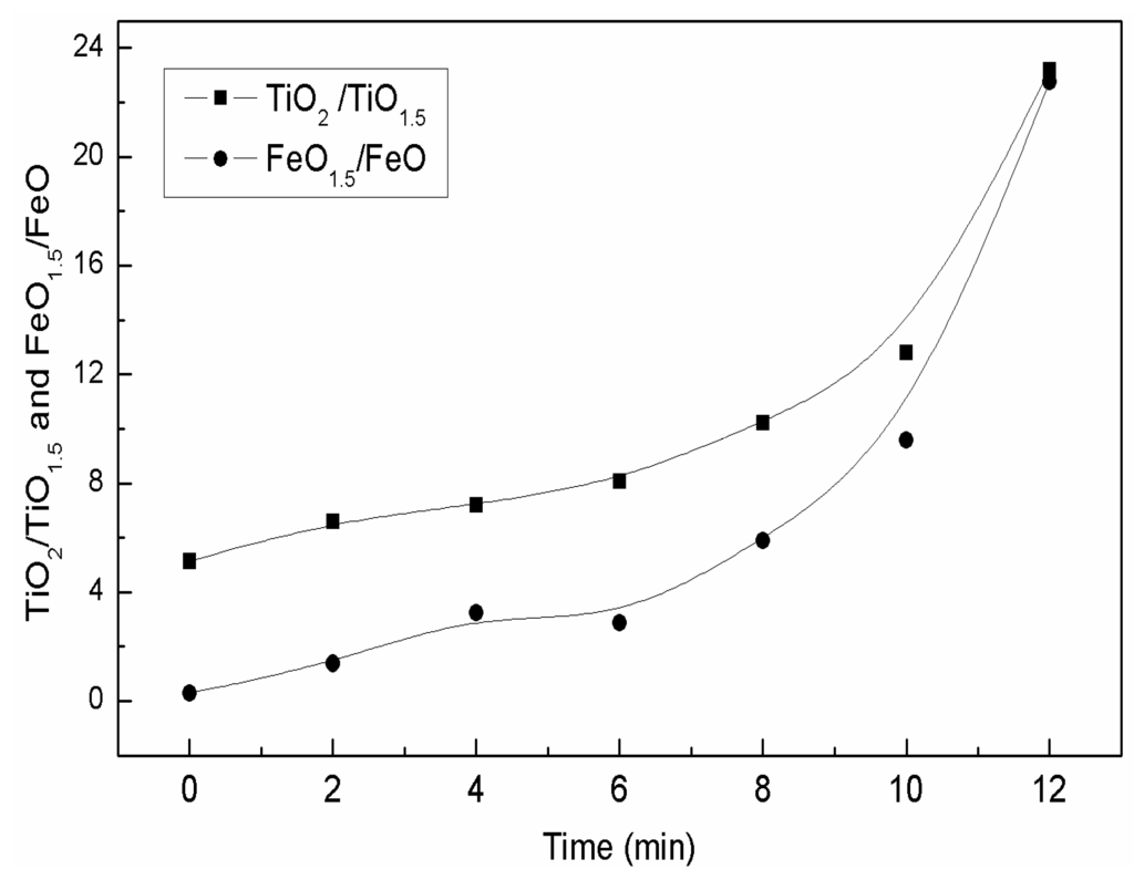 Figure 14 shows the variation ratio of and at 1420 °C. As shown, the change in the relative contents of various ions, such as iron ions and titanium ions in slag is co-ordinated the same. Overall, the slag system is not in equilibrium and the ratio of Fe3+/Fe2+ changes with increasing oxidation temperature for low valence titanium and iron.