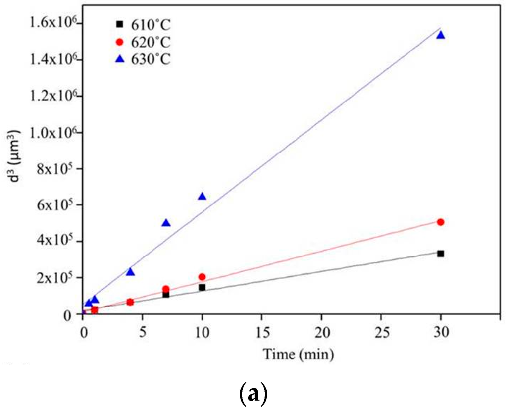 For the growth mechanism of globular grains, when alloys are heated to the temperature of solid-liquid coexistence, two coarsening mechanisms are considered [11,20,21,22,23], namely grain coalescence and Ostwald ripening. Many studies have indicated that the two mechanisms occur at the same time and do not affect each other. Ostwald ripening dominates for long-duration heating and higher liquid fractions, and grain coalescence dominates for short-duration heating and lower liquid fractions. In this study, the growth mechanism of globular grains followed Ostwald ripening, since the coefficients of determination, shown in Table 2, are very close to 1 for n = 3 (volume diffusion) in the LSW theory. This theory indicates that as n becomes closer to 3, Ostwald ripening increasingly dominates. Grain coalescence did not dominate majorly because the method of heating was the salt bath, and thus the sample reached the required temperature quickly and the liquid formed almost immediately.