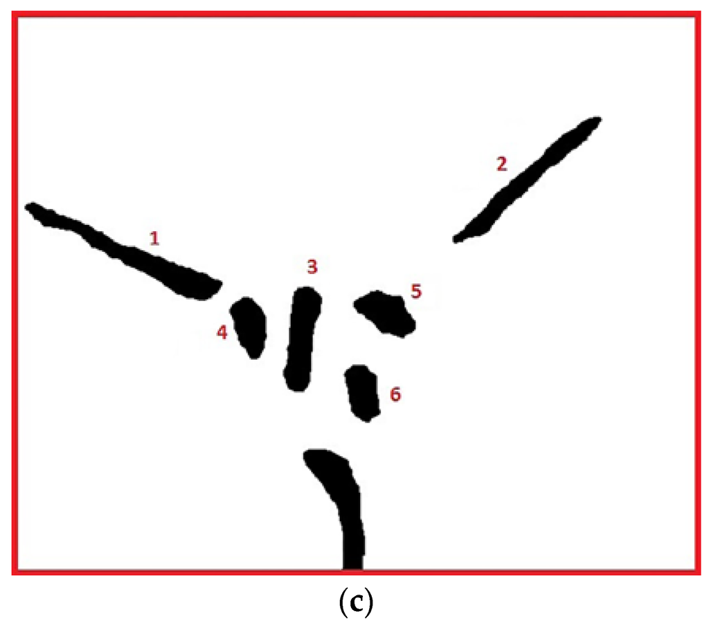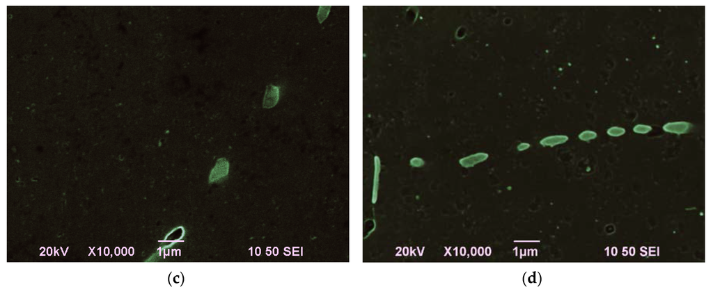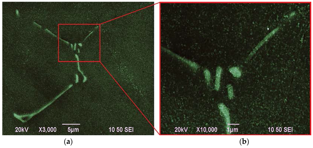 After the standard metallographic observation, measurement of particle dimensions was carried out in the SEM using the appropriate magnification and a suitable numerical aperture as suggested in [21]. The method is indicated for a group of particles (Figure 1a). The group is isolated (Figure 1b) and transferred to the image analysis program (Figure 1c) where the particles are numbered and their dimensions measured. The respective measurements for each particle in the group are depicted in Table 4. In most cases, the measuring frames contained whole particles. In the cases where the frame passes through a particle, then this particle was not taken into account.