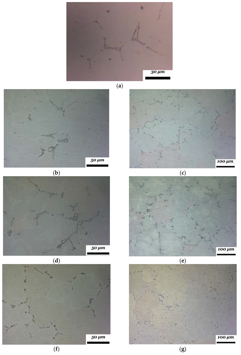 Metallographic images: as-cast (a); homogenized at 560 °C (b) and (c) for 2 h; (d) and (e) for 4 h; (f) and (g) for 6 h.