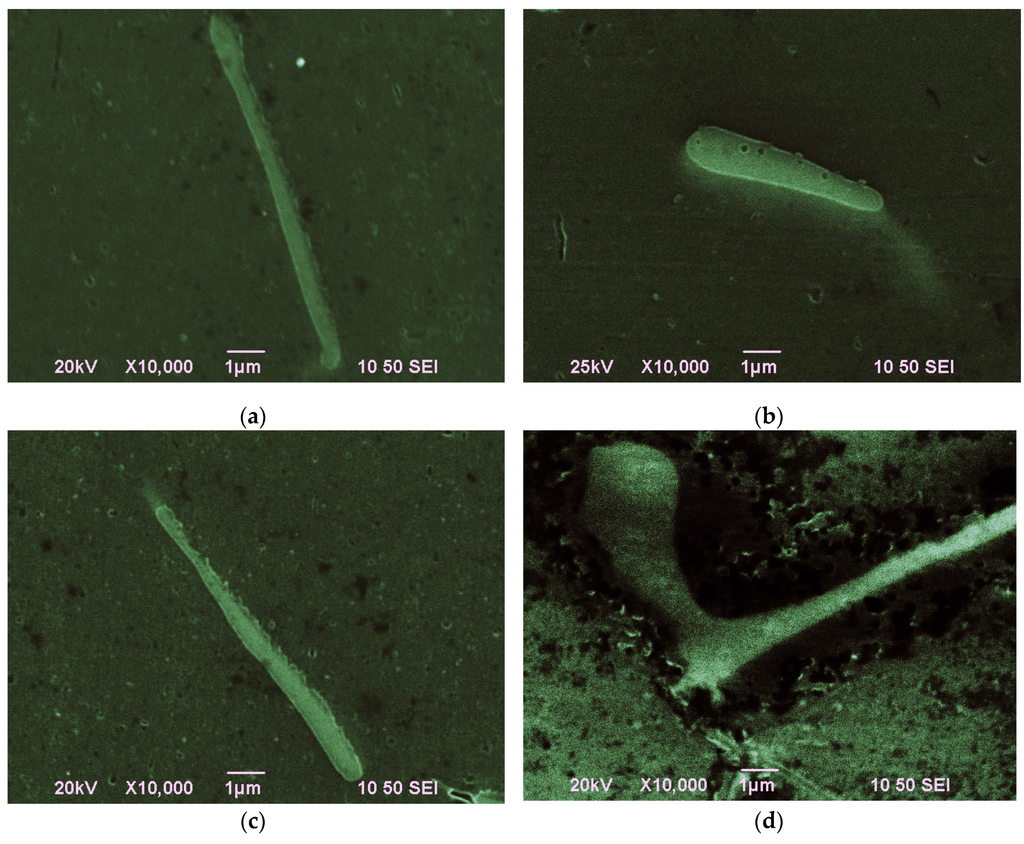 Images indicating the rounding of the edges of the particles after 2 h holding time. (a) Long elongated particle; (b) short particle; (c) elongated particle and (d) particle with segment.