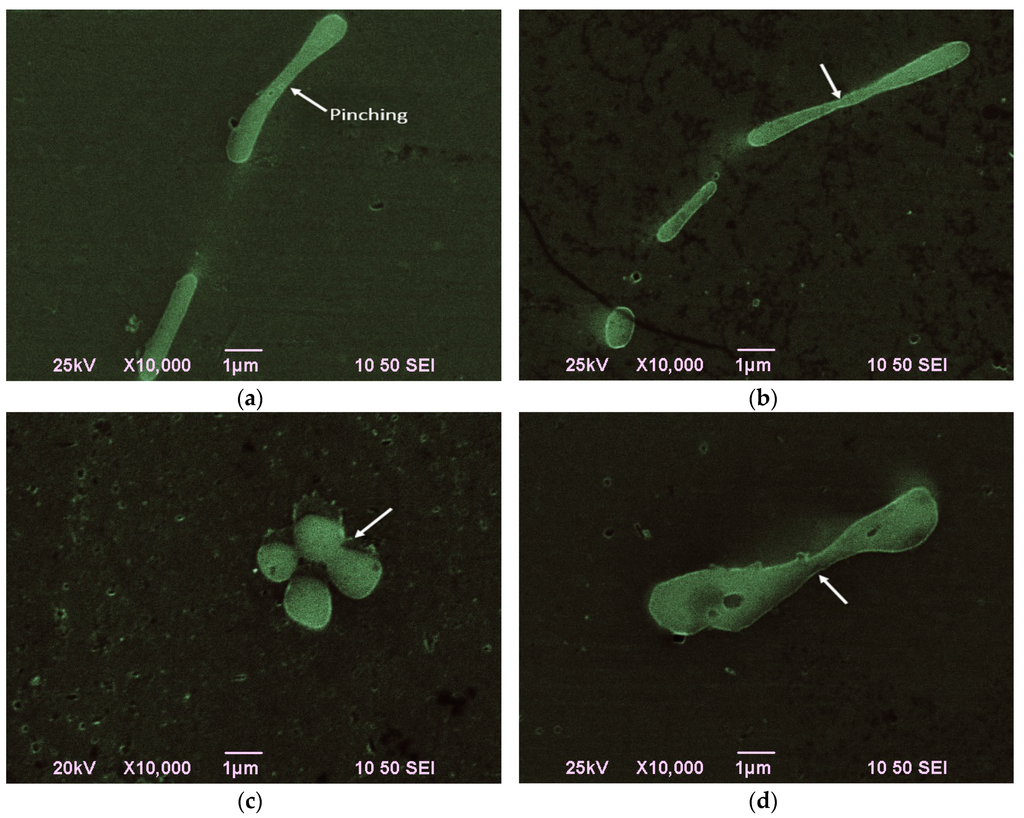 Images revealing the pinching process after 4 h holding time. (a) Local reduction of thickness; (b) pinching at advanced stage with seperation and local thickness reduction; (c) pinching in spherical particles; (d) local necking leading to pinching of a particle.