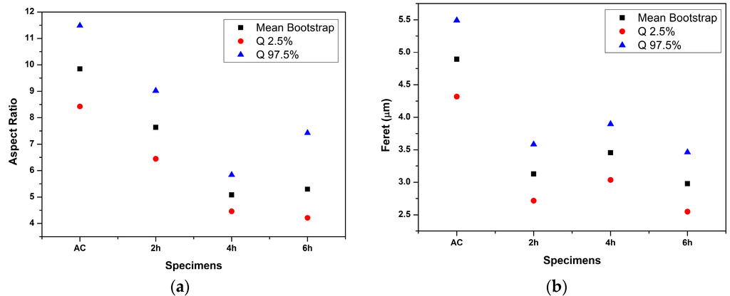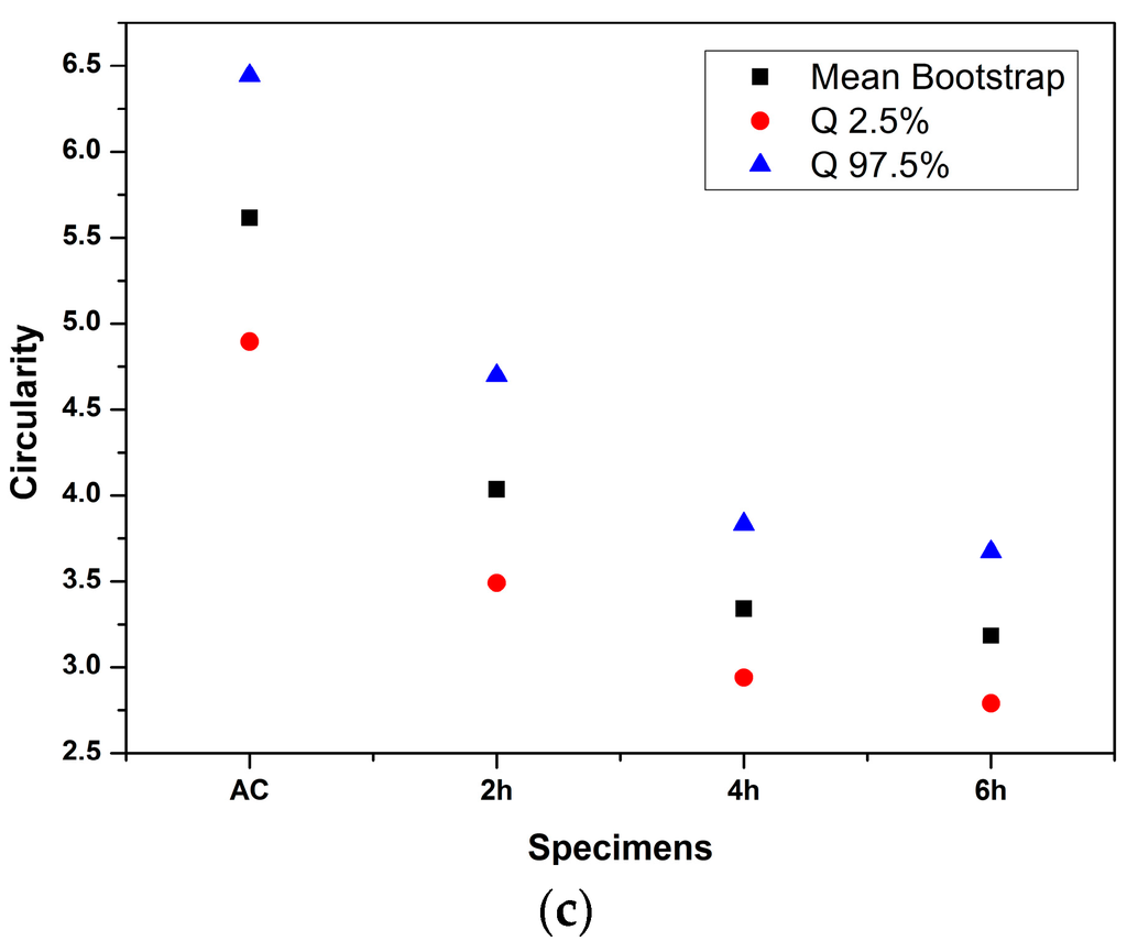 The mean values of microstructural indices, aspect ratio, feret and circularity have been determined for the as-cast and homogenized alloys. The 2.5% and 97.5% quantiles were used to define a confidence interval of 95%. The mean index values for the entire population (not just the measured sample), are located inside the confidence interval and have an expected value given by the Bootstrapped Mean. From these data, which are shown in Figure 6a–c, the following remarks can be made.