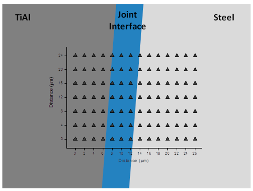 The mechanical behavior was evaluated by nanoindentation using a Micro Materials-Nano hardness apparatus equipped with a Berkovich diamond indenter. Hardness and Young’s modulus were determined by the Oliver and Pharr analysis method [26]. Before the depth-sensing indentation experiments, the tip area function was calibrated using fused silica as a standard. The loading/unloading experiments were run up to a maximum load of 4 mN with a dwell bilayer thickness of 30 s at 0.4 mN during unloading, for thermal drift correction. Indentation matrices with a minimum of 90 measurements were selected in order to test the joint’s interface and both base materials. The scheme of the nanoindentation tests across the joints is represented in Figure 1. Prior to the indentation tests the joints were polished using standard metallographic procedures until a mirror-like surface was achieved.
