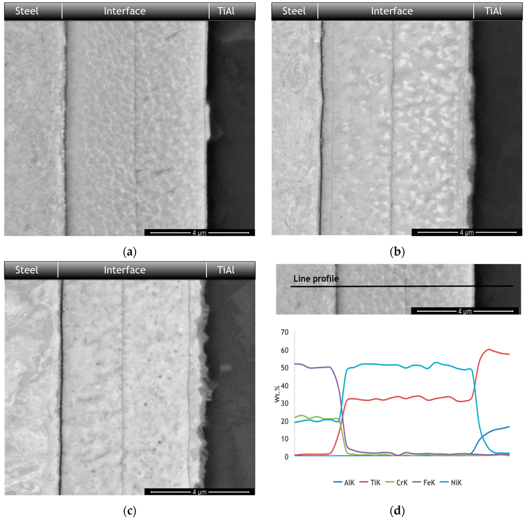 SEM images of the TiAl/steel joints produced at: (a) 700 °C under a pressure of 50 MPa using Ni/Ti multilayers with 30 nm of bilayer thickness; (b) 800 °C under a pressure of 10 MPa using Ni/Ti multilayers with 30 nm of bilayer thickness; (c) 800 °C under a pressure of 10 MPa using Ni/Ti multilayers with 60 nm of bilayer thickness and (d) EDS profile across the interface presented in (a).