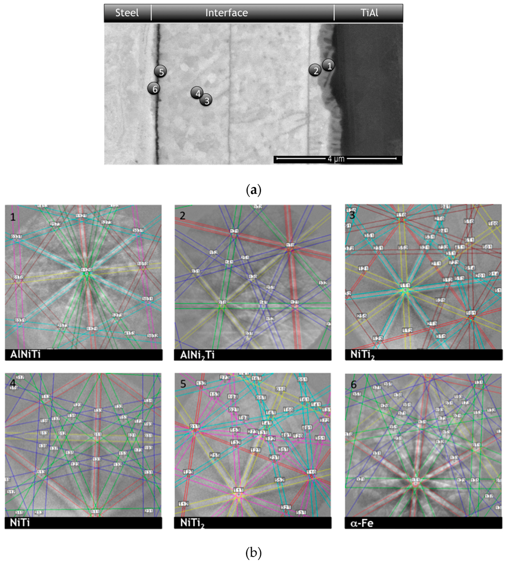 (a) SEM images of the TiAl/steel joints produced at 800 °C under a pressure of 10 MPa and (b) EBSD Kikuchi pattern indexation of the zones marked in (a).