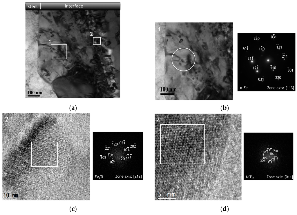 The thin layers close to the steel were also characterized by TEM and HRTEM combined with SAED and FFT, respectively, as shown in Figure 5. The TEM image (Figure 5a) of these layers shows large grains adjacent to the steel identified by SAED as α-Fe (Figure 5b) and a line of nanometric grains identified by FFT of HRTEM images as Fe2Ti (Figure 5c) and NiTi2 (Figure 5d).