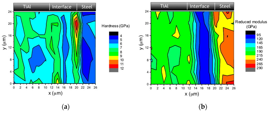 Figure 6 shows the hardness and reduced Young´s modulus (Er) distribution maps for the joints produced at 800 °C using the multilayers with 30 nm bilayer thickness. The interface of the joints shows hardness values similar to those of the base materials with the exception of the thin layers close to the base materials, which are harder, in particular on the steel side. These layers exhibit a high hardness value of about 10–12 GPa. These values may be associated with the formation of AlNiTi, AlNi2Ti and Fe2Ti intermetallics together with nanometric microstructures. In the diffusion bonding of these materials with Ni/Al multilayers, similar results were observed. The reduced Young´s modulus maps clearly reproduce the phase variations across the base materials and diffusion bond, with the joint interface and the diffusion layers perfectly identifiable. According to the nanoindentation results the interface has a lower Young’s modulus (Er ≈ 85–120 GPa) in comparison with the base materials (ErTiAl ≈ 185–210 GPa and Ersteel ≈ 210–260 GPa), which was expected due to the different phases that compose the interface. The variation of the Er values obtained by nanoindentation is in accordance with the Young’s modulus values found in the available literature (Estainless steel > ETiAl > ENiTi > ENiTi2) [27,28].