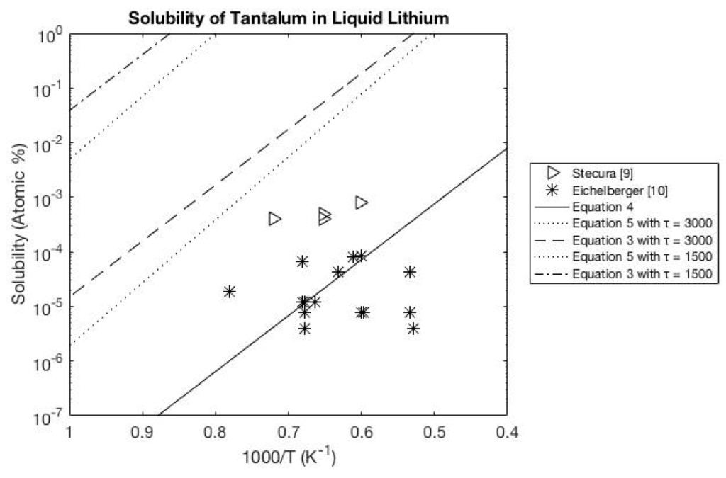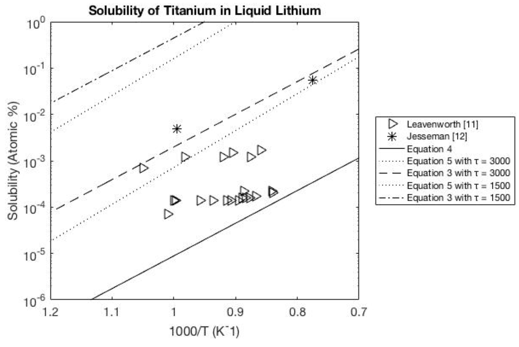 The calculations of the solubility for metals in liquid lithium when including the entropy were generally larger than actually experimentally measured. The solubility of tantalum in liquid lithium in Figure 1 is a typical result for transition metals in liquid lithium. As can be seen in Figure 1, the equations that calculated the entropy with an interaction term, Equations (3) and (5), overestimate the solubility of the tantalum. The solubility equation that neglects entropy, Equation (4), is approximately the correct order of magnitude but its temperature dependence appears to be too strong for most of the data. Figure 2 of the solubility of titanium in liquid lithium shows the experiment data is closer to the estimated solubility of the equations with an entropy parameter of 3000 K but is still lower than predicted.