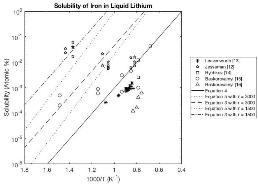 - Minushkin, B. Solution Rates and Equilibrium Solubility of Nickel and Iron in Liquid Lithium; Technical Report NDA-2141-1; United Nuclear Corp.: White Plains, NY, USA, 1961. [Google Scholar]