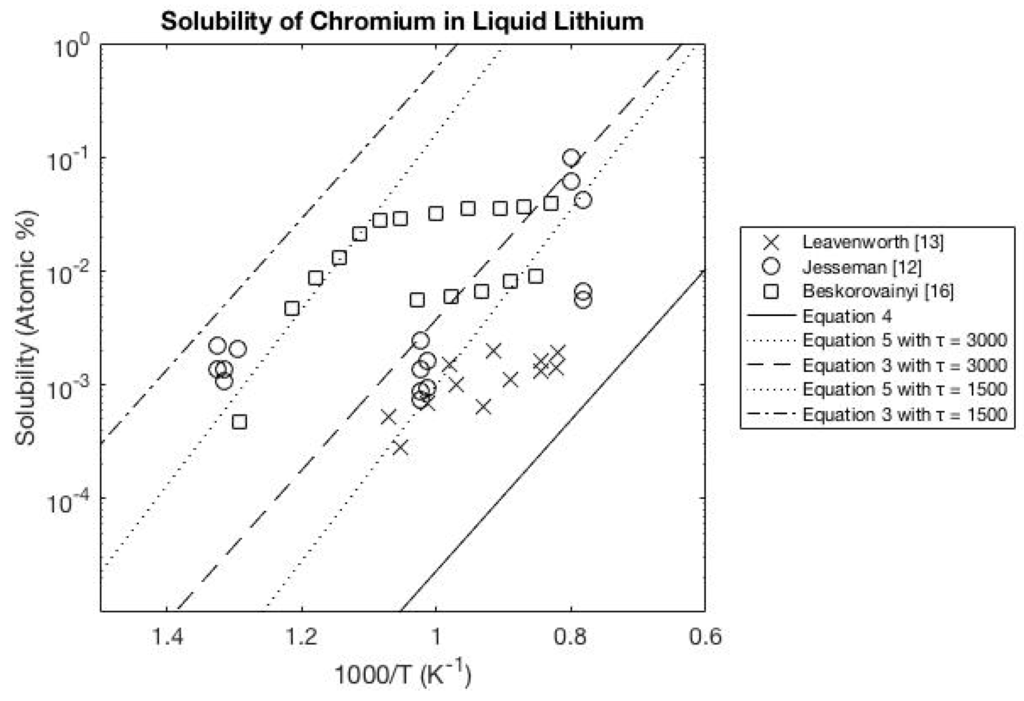 - Leavenworth, H.W.; Cleary, R.E. The solubility of Ni, Cr, Fe, Ti and Mo in liquid lithium. Acta Metall. 1961, 9, 519–520. [Google Scholar] [CrossRef]
