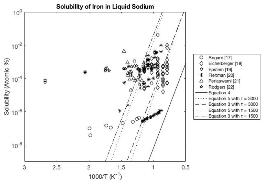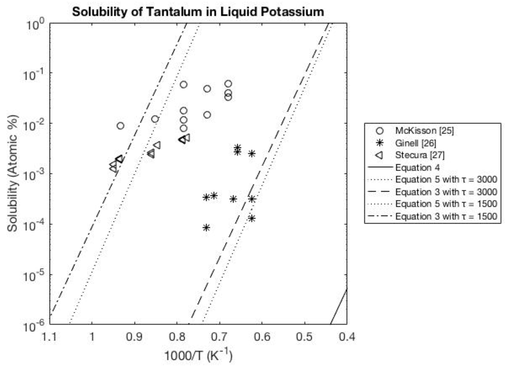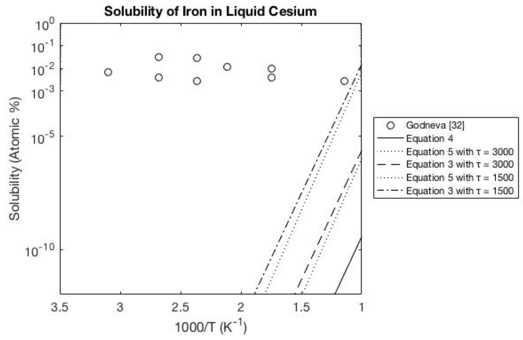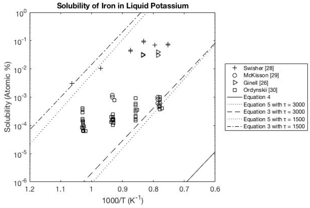 Within this section are several figures that compare the solubility equations to previous experimental data [9,10,11,12,13,14,15,16,17,18,19,20,21,22,23,24,25,26,27,28,29,30,31,32] for transition metals in liquid alkali metals. Additional comparisons are provided in the Appendix for experimental data [33,34,35,36,37,38,39,40,41,42,43,44,45,46,47,48,49,50,51,52,53,54,55] of transition metals in liquid Lithium (Figure A1), liquid Sodium (Figure A2), liquid Potassium (Figure A3), liquid Rubidium (Figure A4) and liquid Cesium (Figure A5).