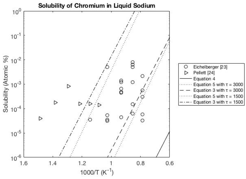 - Eichelberger, R.L.; McKisson, R.L. Solubility Studies of Cr, Co, Mn, Mo, Ni, Nb, Ti, V, and Zr in Liquid Sodium; Technical Report AL-AEC-12955; Atomics International: Canoga Park, CA, USA, 1970. [Google Scholar]