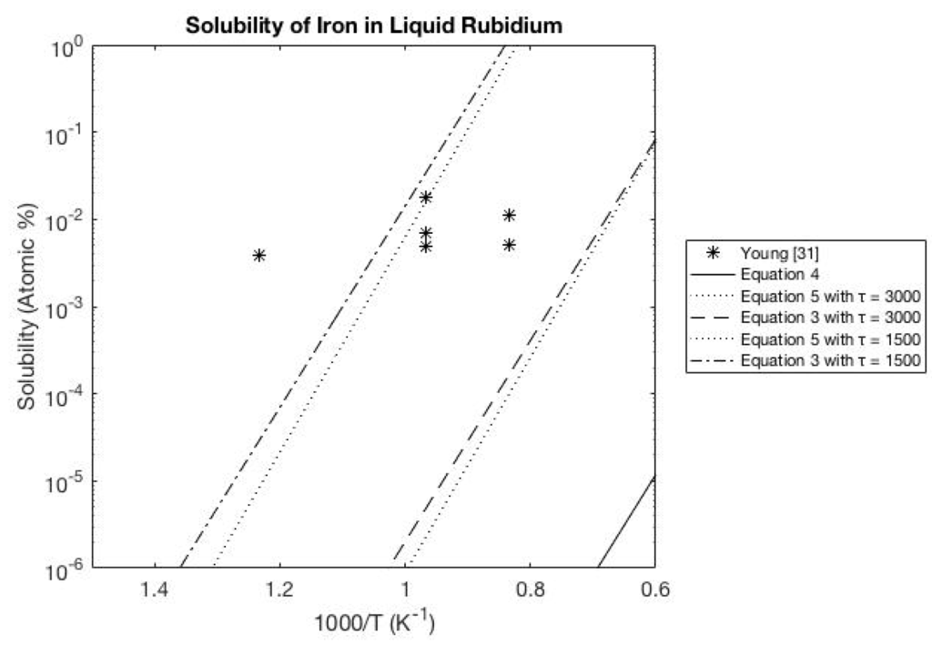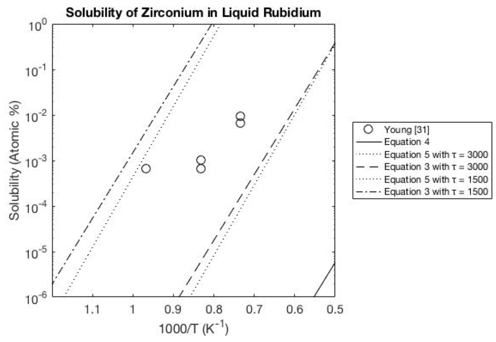 The experimental data for rubidium is sparse compared to the previous alkali liquids. The available data shows a relationship to the calculated solubility that is similar to that of the liquid sodium and potassium systems. Figure 9 and Figure 10 show the solubility of zirconium and iron in liquid rubidium. The experimental data solubility for metals is between the calculations provided when using an entropy interaction parameter of 1500 and 3000 K.