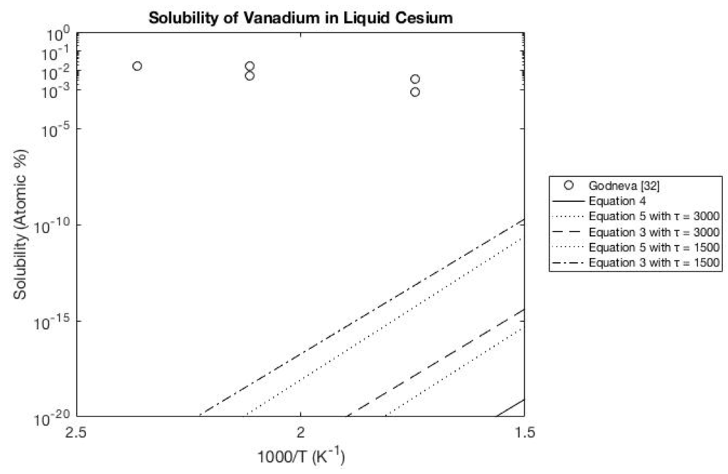 Figure 11 and Figure 12 show of the solubility of iron and vanadium in liquid cesium. Both figures show the experimentally measured solubility being considerably larger than predicted. Also the temperature dependence of the experimental data is negligible compared to that of the model. This negligible temperature dependence is common among the various solubilities in liquid cesium.