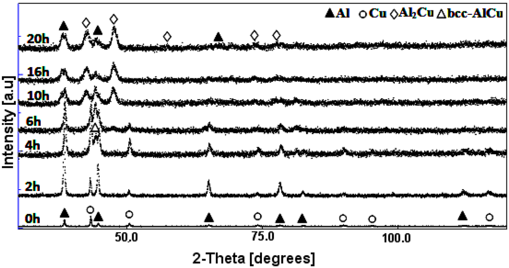 Al (99.5% purity, mean particle size <50 μm, 325 mesh) and Cu (99.95% purity, mean particle size <40 μm, 200 mesh) elemental powders were used as starting materials. The initial powders with the nominal compositions of Al-20 at. %Cu were milled up to 20 h using a planetary ball mill (Pulverisette P7, Fritsch, Industriestraße 8, Idar-Oberstein, Germany) under argon atmosphere. The ball-to-powder weight ratio was maintained as 1:5. The milling was repeated for different milling times (2 h, 4 h, 6 h, 10 h, 16 h, and 20 h) at 600 rpm. To avoid the local temperature rise inside the vials during milling, each 10 min of milling was followed by a pause of 5 min. The structural changes of the milled samples were investigated by X-ray diffraction (XRD) by means of a Bruker D8 Advance diffractometer (Bruker D8; Manning Park Billerica, MA, USA) in a (2θ) geometry using Cu-Kα radiation (λαCu = 0.15406 nm). The XRD data was collected at a slow scan rate of 0.016°/4 s. The microstructural parameters were taken out from the refinement of the XRD patterns by using the MAUD program [19] which is based on the Rietveld method. The evolution of the particle morphology during MA was carried out by means of a scanning electron microscope (SEM) (DSM960A ZEISS, Norman, OK, USA) with energy dispersive X-ray microanalysis (EDX, Norman, OK, USA). Thermal analyses were performed by means of differential scanning calorimetry (DSC, DSC822 apparatus of Mettler Toledo; Columbus, OH, USA) instrument with a heating rate of 20 °C/min up to 700 °C under constant Ar flow.