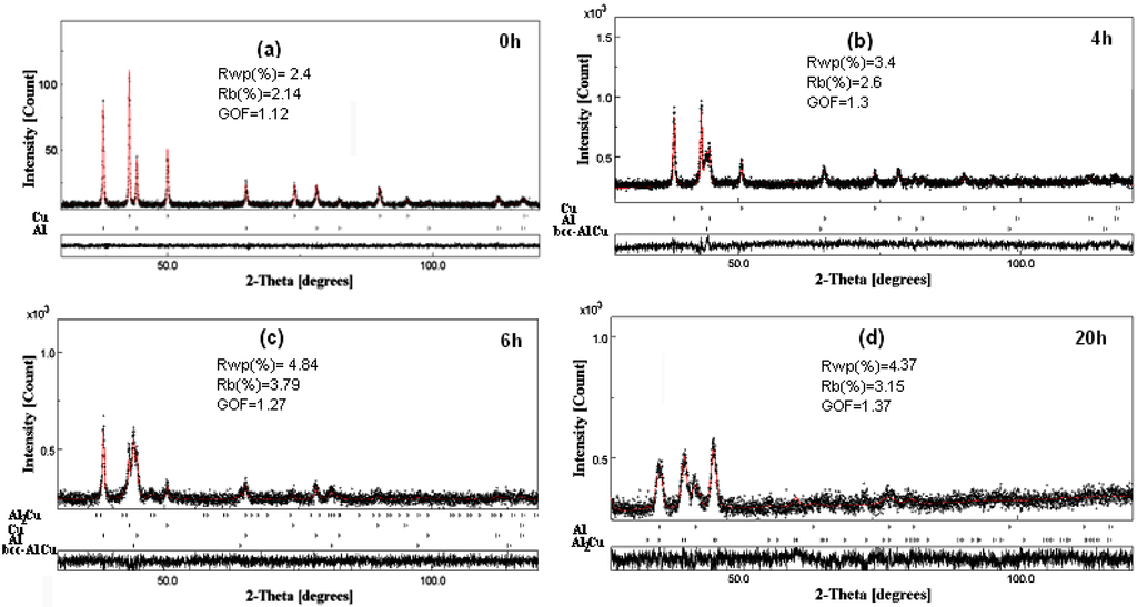 Rietveld refinement of the XRD patterns of the Al-20 at. % Cu powders at different milling times: (a) 0 h; (b) 4 h; (c) 6 h; (d) 20 h.
