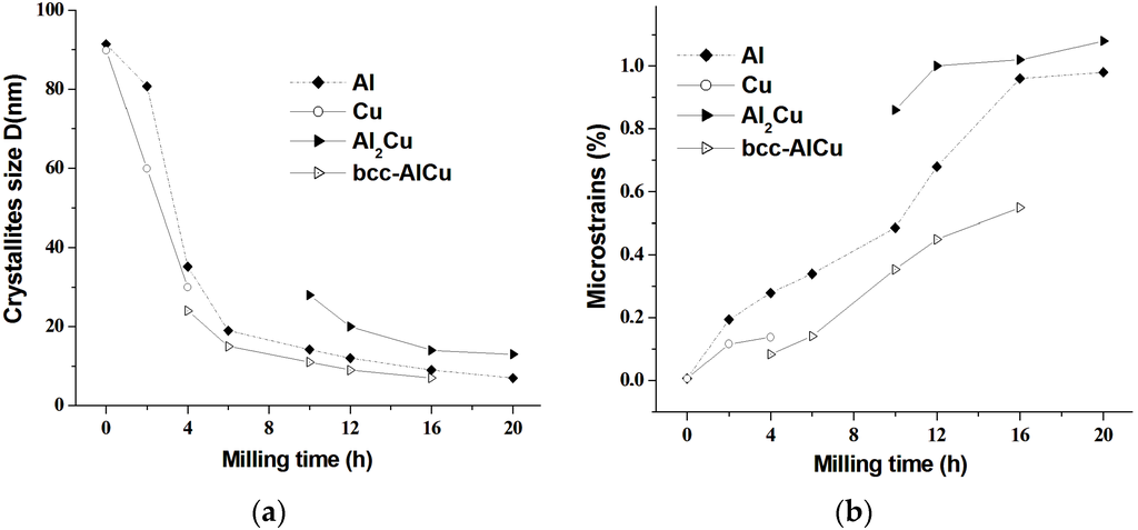 The observed broadening of diffraction peaks suggests the accumulation of lattice strain and a reduction in crystallite size. Figure 3 presents the evolutions of the average crystallite size and microstrains deduced from the Rietveld refinement as a function of milling time. As shown, one can observe an important decrease of the crystallite size and an increase of the microstrains during the first stage of milling (0 to 4 h milling). For a prolonged milling time, both the crystallite size and microstrains become less dependent on the milling time. After 10 h of milling, the bcc-AlCu is characterized by a smaller crystallite size and higher microstrains as compared to the Al2Cu. The final values of the average crystallite size of the Al and Al2Cu phases calculated after 20 h of milling were 7 nm and 13 nm, respectively. The high degree of microstrains in the Al2Cu (1.08%) may be due to a high concentration of stacking faults and a high dislocation density. In general, microstrains may arise from a mismatch in the size of the constituents, an increase in the grain boundary fraction, or a mechanical deformation [22]. The microstrains caused by MA have also been previously reported in the literature and have commonly been attributed to the generation and movement of dislocations [23,24]. In order to investigate the stage’s mechanical stabilities during milling, we have the calculated phase’s proportions of the identified phase as a function of the milling times. Note that there are some phases that progressively decrease (Al and Cu) and others which arise in the form of solid solutions (bcc-AlCu and Al2Cu). In addition, we observe that the percentage of the bcc-AlCu stage reaches a maximum (70%) after 12 h of milling, and then it progressively decreases to a value of 8.80% after 16 h of milling, while the percentage of the Al2Cu phase increases continuously with the milling time to reach its maximum value at a milling time of 20 h (82%). So the final system obtained after 20 h of milling is biphasic with two phases: fcc-Al and tetragonal-Al2Cu phases.