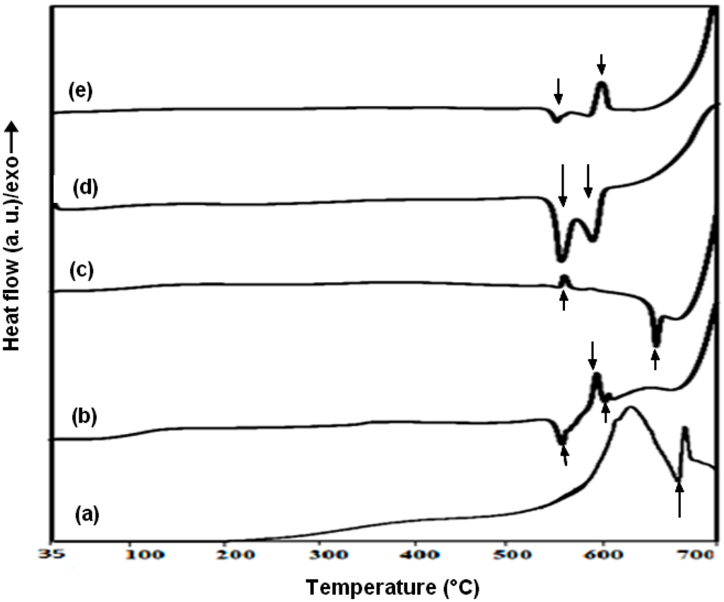 DSC pattern of the Al-20 at. % Cu powders milled for different milling times: (a) 0 h; (b) 4 h; (c) 6 h; (d) 16 h; (e) 20 h.