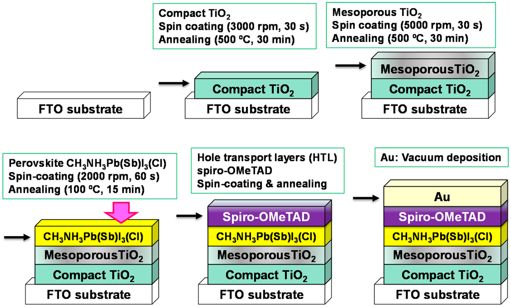 A schematic illustration for the fabrication of the present TiO2/CH3NH3Pb(Sb)I3(Cl) photovoltaic cells is shown in Figure 1. The details of the fabrication process are described in the reported papers [8,19,27,28,29,30], except for SbI3 [22]. F-doped tin oxide (FTO) substrates were cleaned using an ultrasonic bath with acetone and methanol, and dried under nitrogen gas. 0.15 M and 0.30 M TiO2 precursor solution was prepared from titanium diisopropoxide bis(acetylacetonate) (Sigma-Aldrich, Tokyo, Japan, 0.055 mL and 0.11 mL) with 1-butanol (1 mL), and the 0.15 M TiO2 precursor solution was spin-coated on the FTO substrate at 3000 rpm for 30 s, and annealed at 125 °C for 5 min. Then, the 0.30 M TiO2 precursor solution was spin-coated on the TiOx layer at 3000 rpm for 30 s, and annealed at 125 °C for 5 min. This process of 0.30 M solution was performed two times, and the FTO substrate was sintered at 500 °C for 30 min to form the compact TiO2 layer. After that, TiO2 paste was coated on the substrate by spin-coating at 5000 rpm for 30 s. For the mesoporous TiO2 layer, the TiO2 paste was prepared with TiO2 powder (Nippon Aerosil, Tokyo, Japan, P-25) with poly(ethylene glycol) (Nacalai Tesque, Kyoto, Japan, PEG #20000) in ultrapure water. The solution was mixed with acetylacetone (Wako Pure Chemical Industries, Osaka, Japan, 10 μL) and triton X-100 (Sigma-Aldrich, Tokyo, Japan, 5 μL) for 30 min, and was left for 12 h to suppress the bubbles in the solution. The cells were annealed at 120 °C for 5 min and at 500 °C for 30 min to form the mesoporous TiO2 layer [31,32]. For the preparation of the perovskite compounds, a solution of CH3NH3I (Showa Chemical Co., Ltd., Tokyo, Japan, 98.8 mg), PbI2 (Sigma-Aldrich, Tokyo, Japan), NH4Cl (Wako Pure Chemicals Industries, Ltd., Osaka, Japan), and SbI3 (Sigma-Aldrich), with a desired mole ratio in γ-butyrolactone (Nacalai Tesque, 275 μL), and N,N-dimethylformamide (DMF, Nacalai Tesque, 225 μL) was mixed at 60 °C. Addition of the DMF to γ-butyrolactone and NH4Cl to the perovskite phase would improve photovoltaic properties [25,26,33]. The detailed preparation compositions of TiO2/CH3NH3Pb(Sb)I3(Cl) cells with different additives are listed in Table 1. The solution of CH3NH3Pb(Sb)I3(Cl) was then introduced into the TiO2 mesopores by a spin-coating method and annealed at 100 °C for 15 min. Then, a hole transport layer (HTL) was prepared by spin-coating. As the HTL, a solution of 2,2',7,7'-tetrakis[N,Ndi(p-methoxyphenyl)amino]-9,9'-spirobifluorene (spiro-OMeTAD, Wako Pure Chemical Industries, 36.1 mg) in chlorobenzene (Wako Pure Chemical Industries, 0.5 mL) was mixed with a solution of lithium bis(trifluoromethylsulfonyl)imide (Li-TFSI, Tokyo Chemical Industry, Tokyo, Japan, 260 mg) in acetonitrile (Nacalai Tesque, 0.5 mL) for 12 h. The former solution with 4-tert-butylpyridine (Aldrich, 14.4 μL) was mixed with the Li-TFSI solution (8.8 μL) for 30 min at 70 °C. All procedures were carried out in ordinary air. Finally, gold (Au) metal contacts were evaporated as top electrodes. Layered structures of the present photovoltaic cells were denoted as FTO/TiO2/CH3NH3Pb(Sb)I3(Cl)/spiro-OMeTAD/Au, as shown in Figure 1.