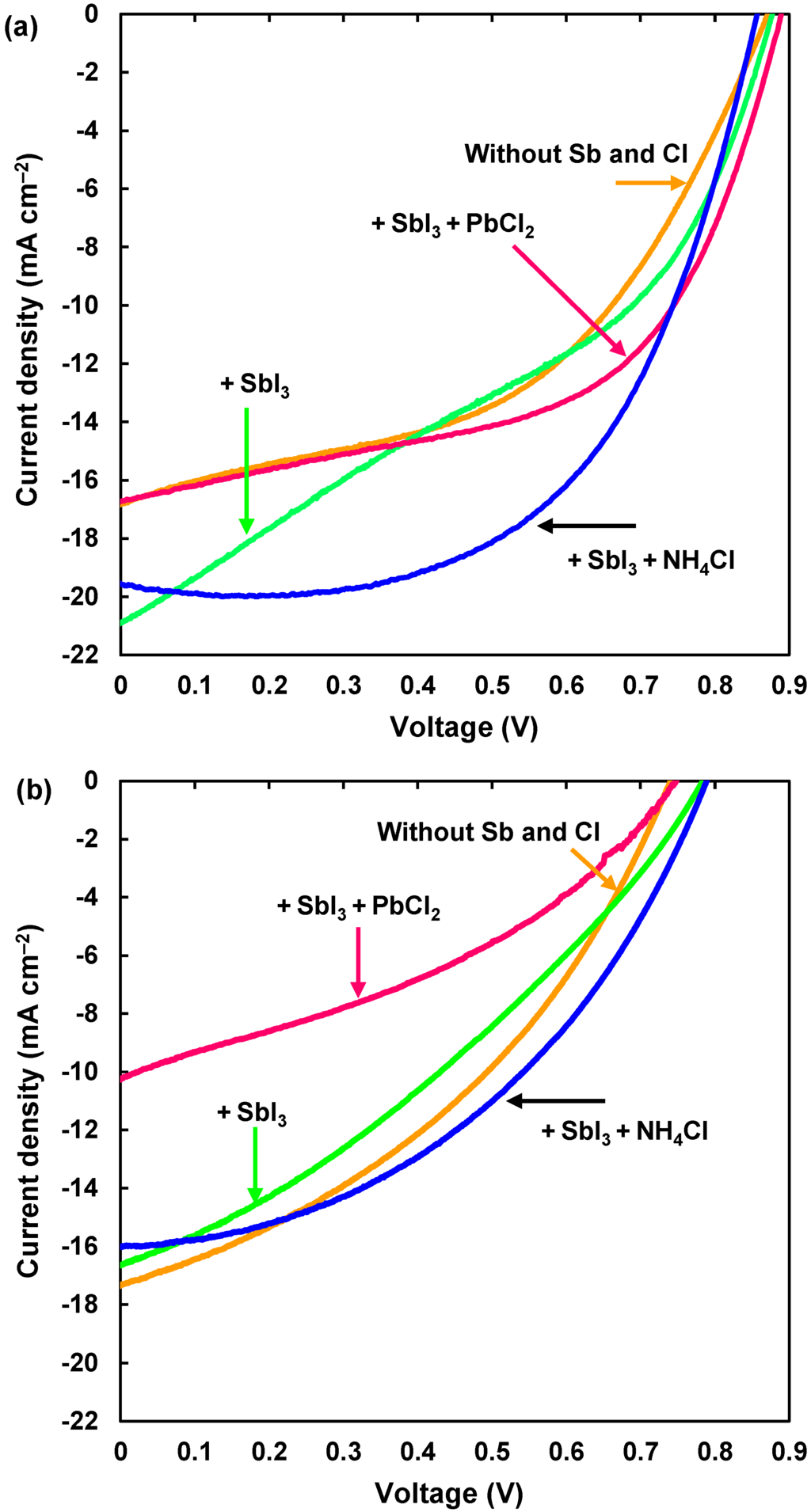 Although the device performance may not be perfectly optimized, the reproducibility of efficiency increases by elemental doping, such as with Cl or Sb, were confirmed in the present and previously reported works [7,20,22,25]. Therefore, it is believed that the addition of dopants, such as Cl or Sb, to the perovskite phase would be effective for the development of device performance. The effect of the Cl-doping without Sb-doping was not investigated in the present work, and further studies are needed.