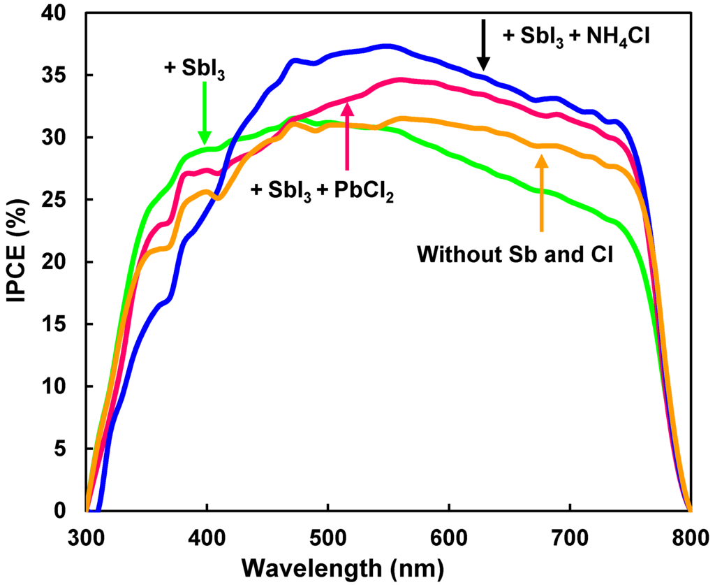 The third is as follows: by adding SbI3 with NH4Cl to the CH3NH3PbI3, the homogeneous surface and interfacial structures formed, which improved the photovoltaic properties, especially the FF values. In addition, the doping effects of Sb and Cl at the Pb and I sites, respectively, would also contribute the improvement of the JSC values. Further studies are needed for precise structure determination of the perovskite structure.