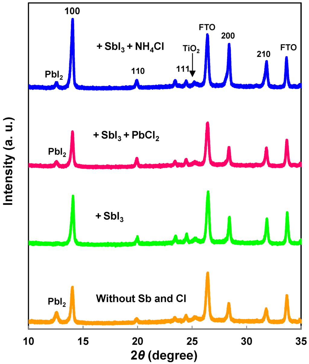 XRD patterns of CH3NH3Pb(Sb)I3(Cl) cells on the FTO/TiO2 are shown in Figure 4. The diffraction peaks can be indexed by a cubic crystal system (Pm3m) for the CH3NH3Pb(Sb)I3(Cl) thin films. Although the deposited films are a single perovskite structure, broader diffraction peaks due to the PbI2 compound appeared in the CH3NH3Pb(Sb)I3(Cl) film, as shown in Figure 4. The Sb addition suppressed the formation of PbI2 [22].