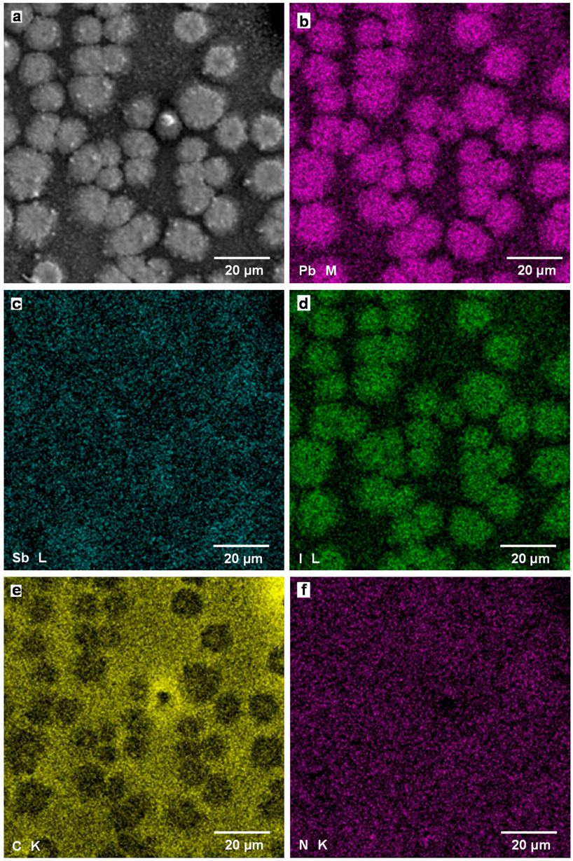(a) SEM image of CH3NH3Pb(Sb)I3(Cl) cell with an additive of SbI3; Elemental mapping images of (b) Pb M line, (c) Sb L line, (d) I L line, (e) C K line, and (f) N K line.