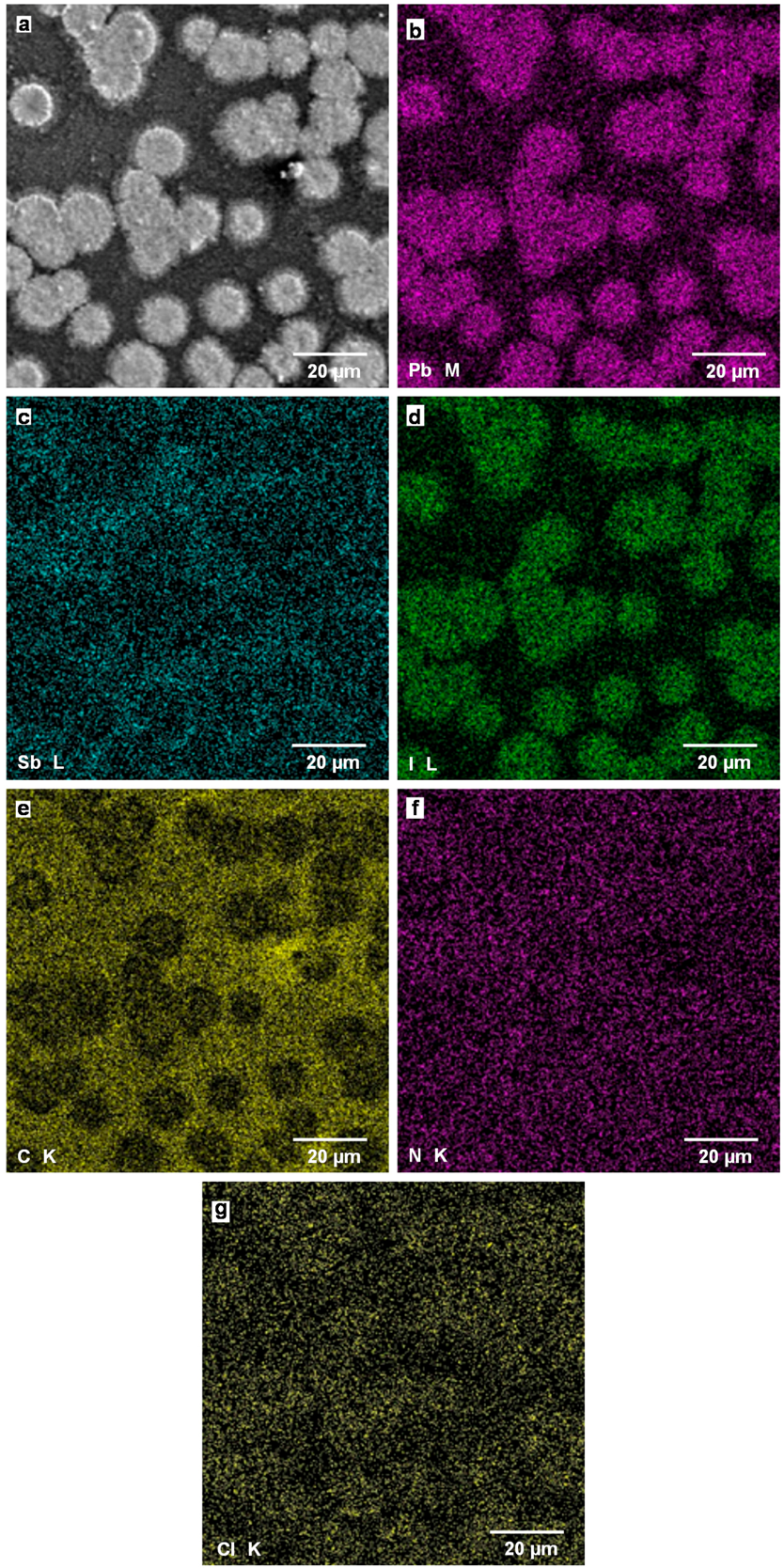 (a) SEM image of CH3NH3Pb(Sb)I3(Cl) cell with additives of SbI3 with PbCl2; Elemental mapping images of (b) Pb M line, (c) Sb L line, (d) I L line, (e) C K line, (f) N K line, and (g) Cl K line.