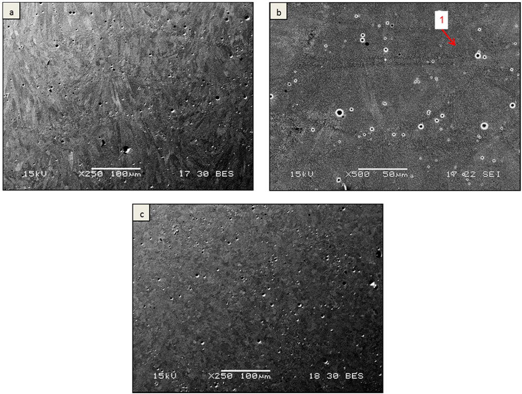 The corrosion behavior was examined by immersion test according to ASTM G31-12a standard and by electrochemical characterization in terms of potentiodynamic polarization analysis. All the corrosion tests were carried out in 3.5% NaCl solution with naturally dissolved oxygen in the electrolyte; the durations of immersion tests were up to 45 days. The pitting characterization was evaluated according to ASTM G46 standard. The potentiodynamic polarization analysis was carried out using a Bio-Logic SP-200 potentiostat equipped with Ec-Lab software V10.44 [10,11]. A standard three-electrode cell with a reference saturated calomel electrode (SCE) was used for this examination; the scanning rate was 0.5 mV/s. The low cycle corrosion fatigue (LCCF) tests in 3.5% NaCl solution were evaluated using a standard bending machine with a strain control apparatus [12]. The shape of the fatigue test specimen was rectangular with neck dimensions of 16 mm length, 8 mm width, and 2 mm thickness. The total length of the fatigue specimen was 80 mm and the radius of curvature at the neck area intersection was 15 mm. The low cycle fatigue test parameters included strain amplitude of 3% and frequency of 0.6 Hz. The bending stress direction in the printed alloy was perpendicular to the ZX printing orientation.