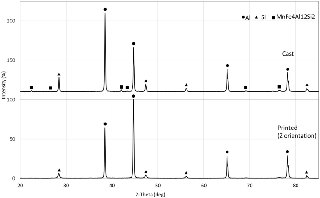 The X-ray diffraction analysis shown in Figure 3 supports the assumption that the amount of Fe-Mn precipitates with the formulation of MnFe4Al12Si2 was relatively increased in the cast alloy. The different intensities between the printed alloy compared to the cast alloy were related to the inherent epitaxial solidification nature of the printed alloy.