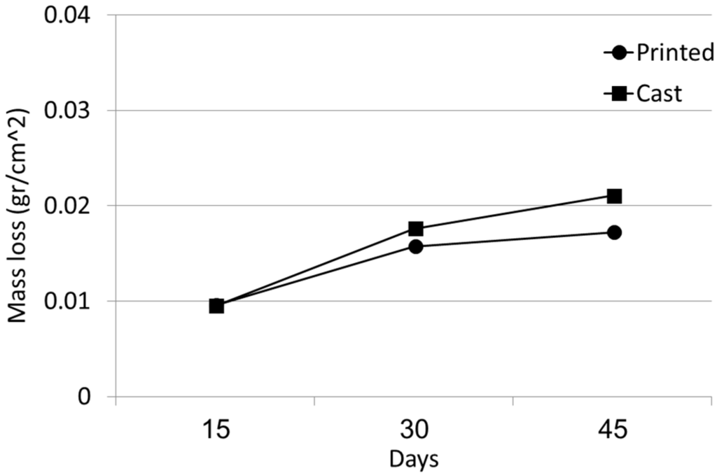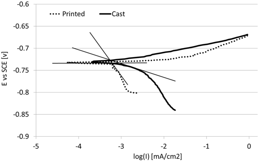 Electrochemical analysis of printed and cast alloys in terms of potentiodynamic polarization and Tafel extrapolation are shown in Figure 6 and Table 3, respectively. This revealed that the polarization curve of the cast alloy was relatively shifted to higher current densities, which indicates reduced corrosion resistance. This observation was also supported by the Tafel extrapolation measurements showing that the corrosion rate of the printed alloy was 0.23 mpy compared to 0.28 mpy in the cast alloy.