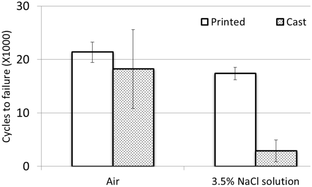 The life spans of printed and cast alloys obtained by low cycle corrosion fatigue in terms of the number of cycles to failure are shown in Figure 7. This indicates that the life span of the printed alloy was slightly larger than that of the cast alloy in air atmosphere and considerably larger in the corrosion environment of 3.5% NaCl solution. The correlated micrographs of the fracture surface obtained in 3.5% NaCl solution are shown in Figure 8. Relating to the printed alloy it can be seen that the cracking initiated from surface pitting and propagated across the sample creating a relatively smooth fracture surface before final snapping. In the case of the cast alloy it was evident that the cracking started from an irregular defect located very close to the surface area and the crack propagation across the sample was mainly along the casting defects [19,20].