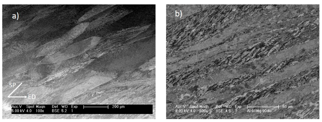 - Ferrasse, F.; Segal, V.M.; Hartwig, T.K.; Goforth, R.E. Microstructure and properties of copper and aluminium alloy 3003 heaviely worked by equal angular extrusion. Metall. Mater. Trans. A 1997, 28, 1047–1057. [Google Scholar] [CrossRef]