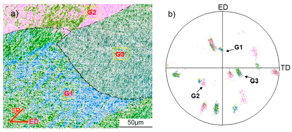 - Hurley, P.; Humphreys, F.J.; Bate, P. An objective study of substructural boundary aliognment in aluminium. Acta Mater. 2003, 51, 4737–4750. [Google Scholar] [CrossRef]
