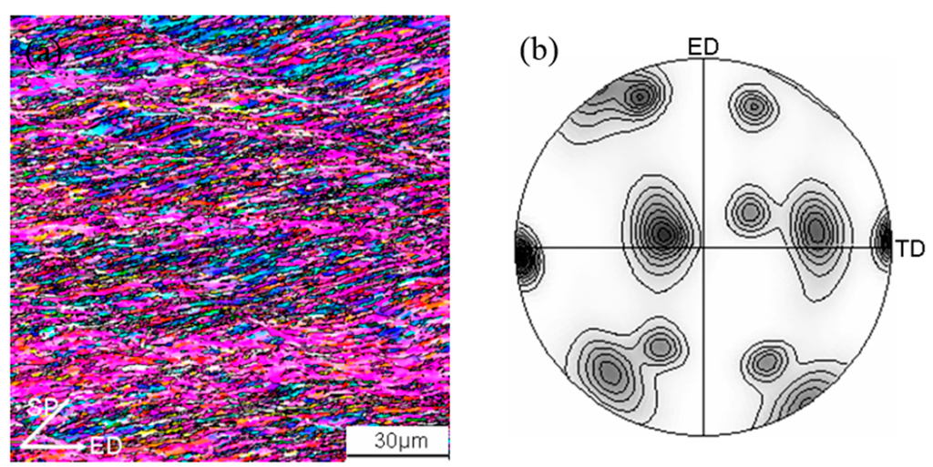 - Kliauga, A.M.; Bolmaro, R.E.; Ferrante, M. The evolution of texture in an equal channel pressed aluminium AA1050. Mater. Sci. Eng. A 2015, 623, 22–31. [Google Scholar] [CrossRef]