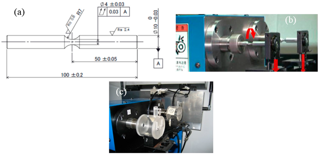 All plate or round bars of aluminum alloys were machined as experimental samples based on the demands of shape and size as shown in Figure 1. The specimen (total length = 100 mm and diameter = 10 mm) is the minimum diameter of φ4 mm, which formed a circumferential notch to localize the crack initiation site. After machining, all of the specimens were prepared by an electro-polishing method after hand grinding at −20 °C at a voltage of 70 V for approximately 5–10 s. The polishing etchant was a solution of 5% perchloric acid and 95% glacial acetic acid. This treatment can remove the work-hardened or oxidized layer of the sample and then reduce the residue stress. The surface roughness (Re) and the stress concentration factor of each specimen were controlled approximately 0.80 μm by using the different abrasive papers (1000, 1200, 2000 grits, respectively) and 1.08 by using the radius of curvature of notch, respectively. The applied stress level in the rotation bending fatigue tests is estimated as follows [6,12,14]: