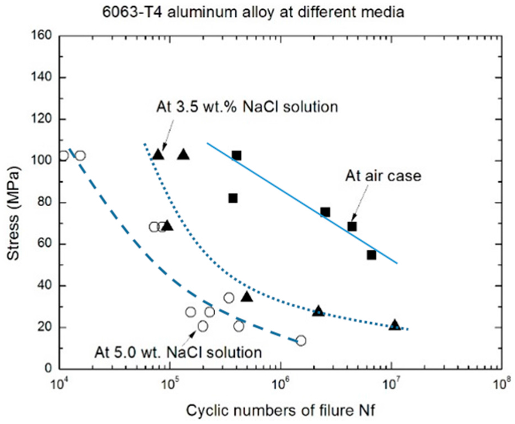 - With increasing of cycles to failure, the effect of mechanical properties of materials on the corrosion fatigue performance becomes relatively weak. For example, when the stress ratio is 0.2, the corrosion fatigue lives of AA7475-T7351 and AA7075-T651 at 5.0 wt. % NaCl aqueous solution are approximately the same values of about 6.5 × 105, and the corrosion fatigue lives of AA2024-CZ and AA2024-T4 at 5.0 wt. % NaCl aqueous solution are 1.6 × 106, 3 × 106, respectively.
