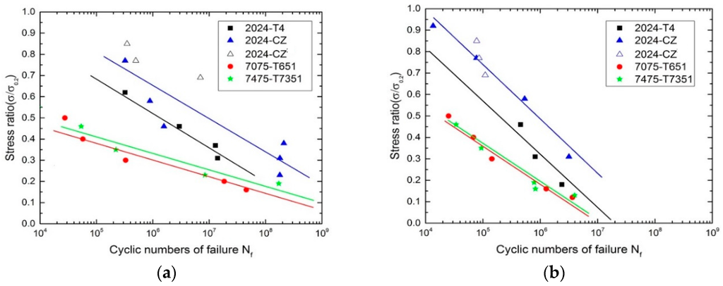 Figure 3, in which fatigue data marked as Δ (AA2024-CZ) is from Chang et al. [19], indicated the influence of the relative strength (σ/σ0.2 by the non-dimension of applied stress and offset yield strength) on HCF performances of aluminum alloys in different media. AA7475-T7351 and AA7075-T651 are high strength aluminum alloys (the tensile strength is more than 500 MPa), and AA2024-CZ and AA2024-T4 are high ductility aluminum alloys (the elongation ratio (δ%) is about 20%). The difference of fatigue behaviors between high strength aluminum alloys (AA7475-T7351 and AA7075-T651) can be ignored based on the slopes and the difference of stress ratio for S-N curves in the different media, in which the slopes in S-N curves of high strength aluminum alloys (AA7475-T7351 and AA7075-T651) are approximately the same and the differences of fatigue lives are approximately the same at the different stress ratios, especially in corrosion media. However, like the high ductility aluminum alloys (AA2024-CZ and AA2024-T4), there are not small differences of fatigue performances at the same stress ratios in the different media, although the slopes in S-N curves of AA2024-CZ and AA2024-T4 have only slight differences in either the air case (Figure 3a) or NaCl aqueous solutions (Figure 3b,c). It was found that the effect of deformed capacity on the fatigue damage resistance in the different media is much more obvious. On the other hand, the fatigue lives of high strength (AA7000 series) aluminum alloys are shorter than that of high ductility (AA2000 series) aluminum alloys in the different media, especially in NaCl aqueous solutions. This reflects a fact that the effect of corrosive environment is much stronger on the fatigue performance of high strength aluminum alloys than that of high ductility aluminum alloys under the stress ratio. For example, when the stress ratio is 0.5, the corrosion fatigue lives of AA7475-T7351 and AA7075-T651 at 5.0 wt. % NaCl aqueous solution are the same approximate values of about 2.5 × 104, and the corrosion fatigue lives of AA2024-CZ and AA2024-T4 at 5.0 wt. % NaCl aqueous solution are 2 × 105, 6 × 105, respectively. With the increasing of cyclic number to failure or the reducing of stress ratio, the influencing trend becomes smaller. One of the reasons is that slight strain change-enhanced anodic dissolution and concomitant cathodic hydrogen generation might play an important role in accelerating fatigue damage of high strength aluminum alloys compared with high ductility aluminum alloys [20]. However, the difference of corrosion fatigue behavior between high strength aluminum alloys (such as AA7475-T7351 and AA7075-T651) at 3.5 wt. % NaCl aqueous solution is close to that at 5.0 wt. % NaCl aqueous solution as shown in Figure 3b,c, which will be beneficial to predicating fatigue lives of high strength aluminum alloys.