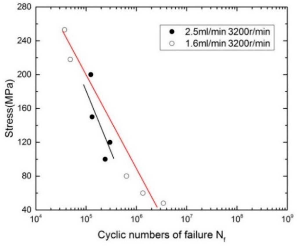 To explore the effect of corrosion solution sorption time or amount on the fatigue damage of samples’ free surface, Figure 4 shows the S-N curves of AA2024-T4 aluminum alloy under the different rates of dropping corrosion liquid (at 5.0 wt. % NaCl aqueous solution). It was clearly found that the rate of dropping corrosion liquid directly affects the fatigue life of AA2024-T4 aluminum alloy. The faster the rate of dropping corrosion liquid, the shorter the fatigue life of AA2024-T4 aluminum alloy. One of the effective reasons may be because the corrosive NaCl liquid with the 2.5 mL/min is much easier to accumulate on the specimen surface than that with the 1.6 mL/min, in which the corrosion solution always adheres to the surface of samples at the 2.5 mL/min state, but its difference is not greater than that at 1.6 mL/min during the HCF damage process. That is, the effect of corrosion solution sorption time or amount on the surface damage of sample can be ignored when the rate of dropping corrosion liquid is beyond 1.6 mL/min. As the rate of dropping corrosion liquid is less than 1.6 mL/min, it is worth further study.