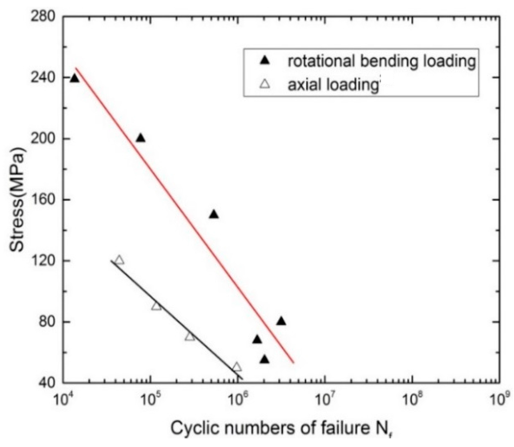 Figure 5 shows the comparative results about the effect of applied cyclic loading styles on the fatigue life of AA2024-CZ aluminum alloy at 3.5 wt. % NaCl aqueous solution. Fatigue data of AA2024-CZ aluminum alloy under the axial cyclic loading are from Wu [21], and fatigue data of AA2024-CZ under the rotational bending cyclic loading style are based on our experimental results. As the same AA2024-CZ aluminum alloy, it was found that the effect of applied cyclic loading style on the fatigue life of AA2024-CZ aluminum alloy is obvious. This is because the stress (strain) gradient exists in the cross-section of sample under rotation bending cyclic loading style, but it does not exist in that under push-pull cyclic loading style although the stress ratio (R = −1) and the stress levels reach the same conclusions [22]. Therefore, for the same material and stress level, the fatigue life of the former is obviously longer than that of the latter as shown in Figure 5.