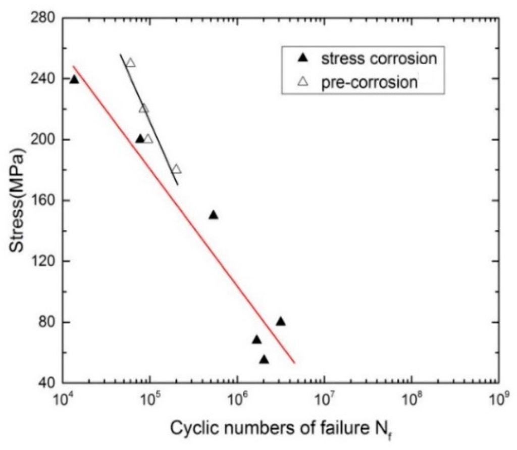 Most researchers have previously reported fatigue data of aluminum alloys under pre-corrosion mode based on the equivalent life concept according to airplane structure subjected to two main factors of environment corrosion and fatigue loading [9,23,24,25]. These results indicated that the differences between the cyclic stress corrosion and prior-corrosion HCF damage behaviors of aluminum alloys are always existent. Figure 6 shows quantificationally the difference of fatigue behaviors under different corrosion modes for AA2024-CZ aluminum alloys. The fatigue life under the prior-corrosion mode is obviously longer than that under the stress corrosion fatigue mode. However, with the decreasing of the applied stress level or increasing of the cyclic number, the difference of fatigue life becomes insignificant. It hints that the fatigue damage model under the prior-corrosion mode can be divided into two parts including low-cyclic fatigue (LCF) and HCF models in the different media. Typical results indicated that for AA2024-CZ aluminum alloys, the fatigue crack initiation and propagation under stress corrosion mode is easier than that under prior-corrosion in the same condition. One of the important reasons is that the size and shape of corrosion pits depend directly on the fatigue crack initiation of aluminum alloys, in which the maximum depth of corrosion pit (measured area is about 3 mm × 3 mm) is about 50–60 μm. The depth of corrosion pit was controlled by using the 20% EXCO (NaCl: 3.5 wt. %, KNO3: 0.5 mol/L, HNO3: 0.1 mol/L) solution at 25 ± 3 °C for holding 6 h in the salt fog cabinet to accelerate surface corrosion of AA2024-CZ aluminum alloy. With increasing of holding time, the depth of corrosion pits becomes bigger and bigger so that the fatigue crack initiation life of aluminum alloy becomes shorter [9].