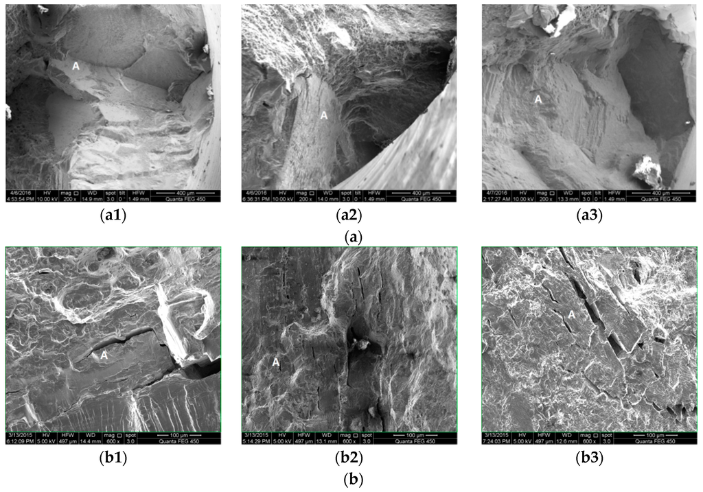 Scanning electron microscopy (SEM) fracture morphologies for AA6063-T4 and AA7475-T7351 in the different media. (a) AA6063-T4; (a1) in the air case; (a2) in the air case; (a3) at 3.5% NaCl solution; (a4) at 5.0% NaCl solution; (b) AA7475-T7351; (b1) in the air case; (b2) at 3.5% NaCl solution; (b3) at 5.0% NaCl solution.