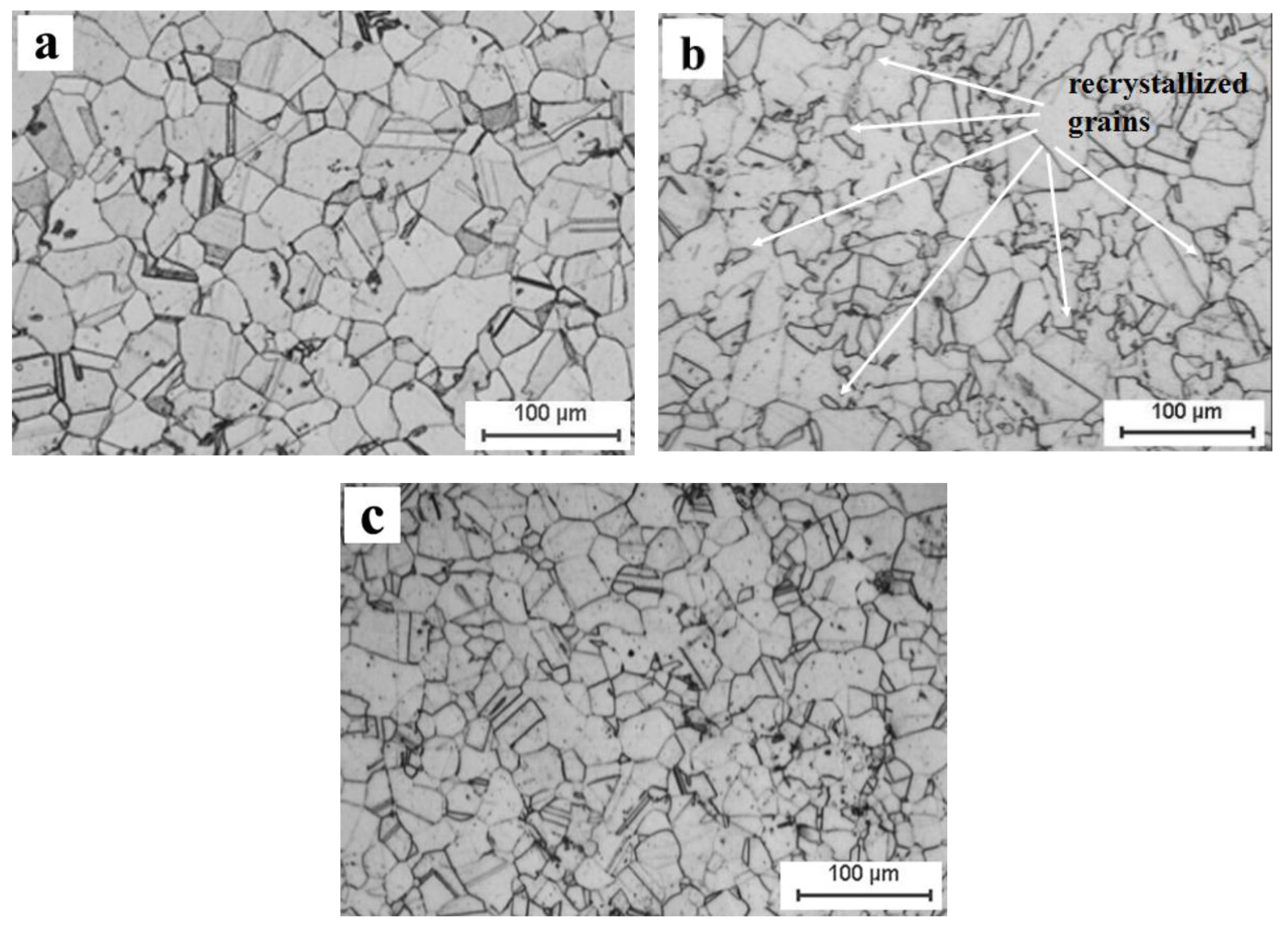 The microstructures of the superalloy under different deformation conditions: (a) initial; (b) 1323 K, 0.001 s−1, deformation amount = 40%; (c) 1323 K, 0.001 s−1, deformation amount = 70%.