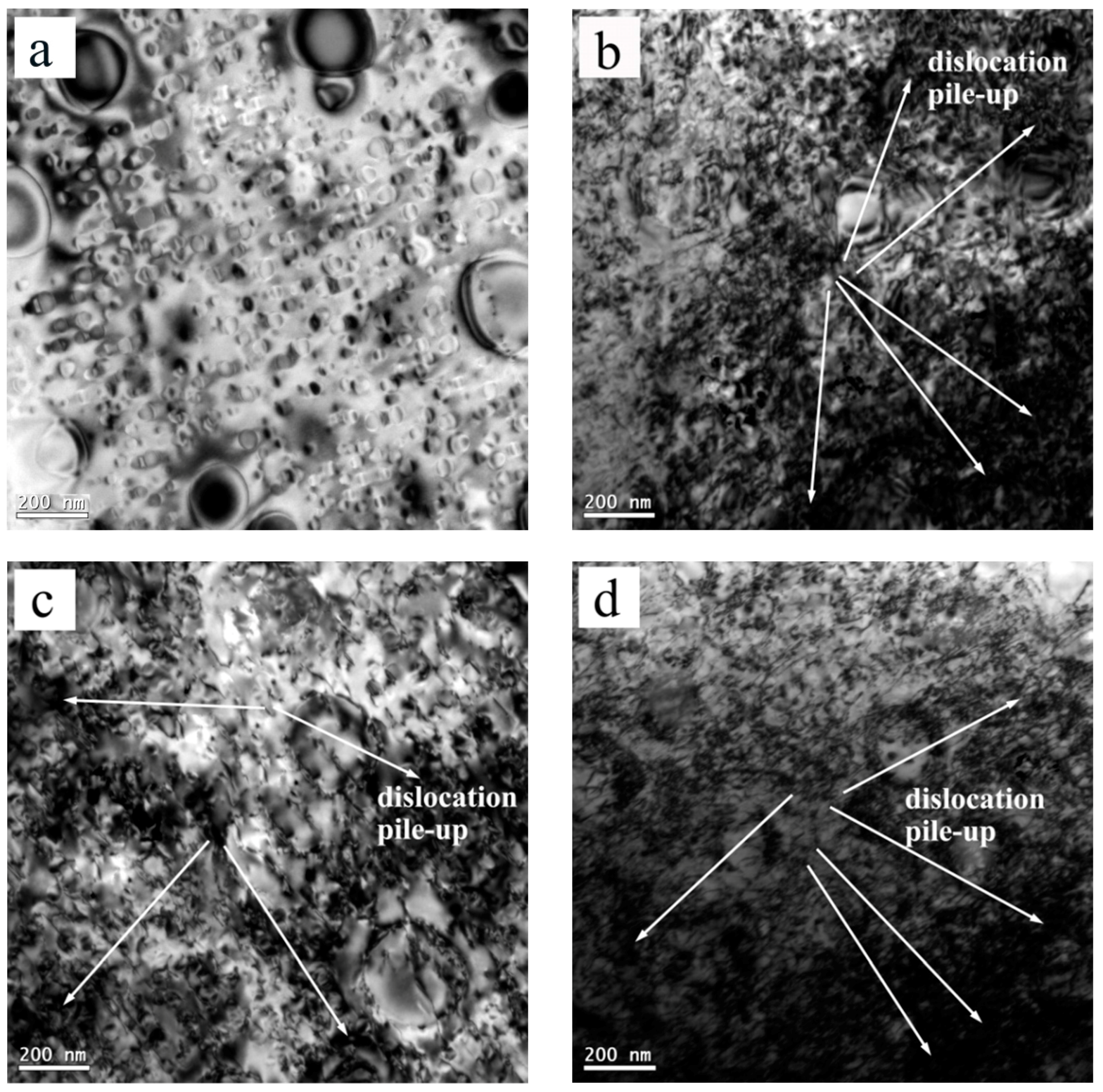 The metallographs of the superalloy under different deformation conditions are shown in Figure 2. It can be seen that the recovery and recrystallization promote grain refining in the process of thermal deformation. Figure 2c shows that the effect of recovery and recrystallization is more obvious than that in Figure 2b. The stronger the softening effect is, the smaller the sizes of grains are. Figure 3 shows the TEM microstructure photos of the superalloy under different deformation conditions. The Figure 3a is the TEM microstructure photo of the initial crystal grains of the alloy. The density of the dislocation is relatively lower. The Figure 3c shows the TEM microstructure of the material, and the dislocations pile up seriously under these deformation conditions. From Figure 3b,d, it can be seen that the density of dislocations or dislocation tangles is more serious and obvious. As mentioned above, this is due to the fact that the deformation resistance is smaller under a higher deformation temperature and lower strain rate.