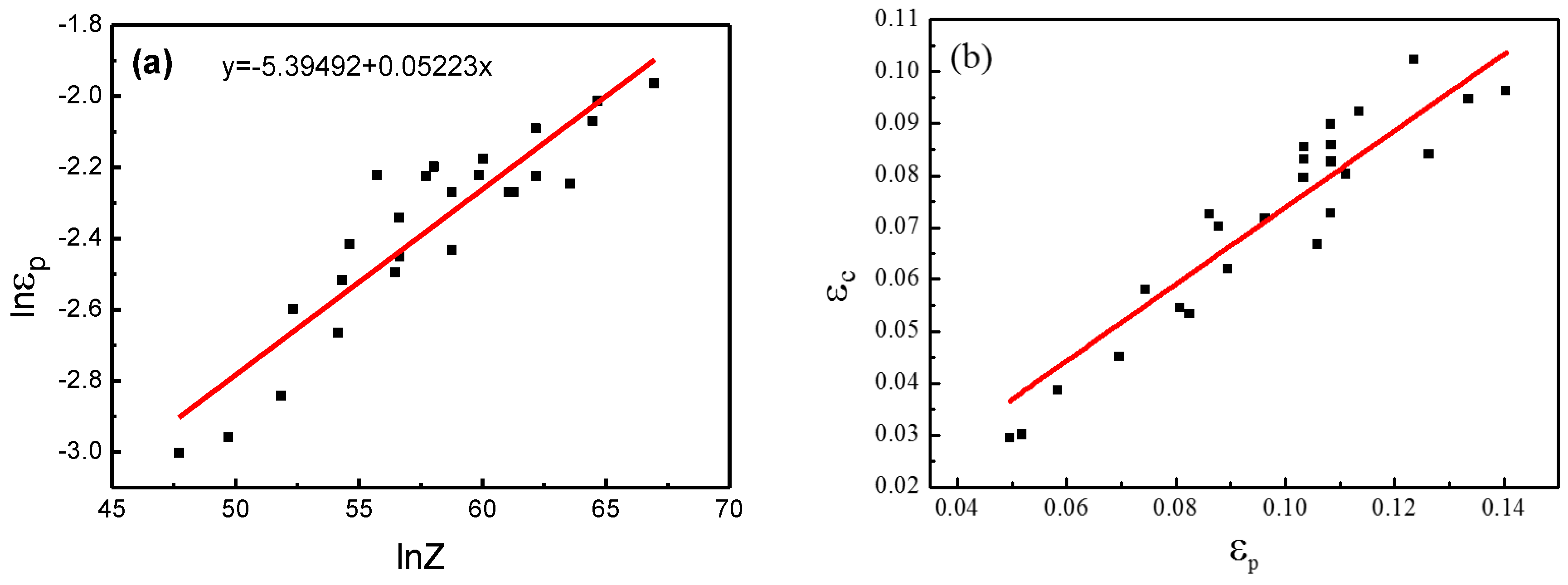 The plots of (a) lnεp-lnZ and (b) εc-εp.