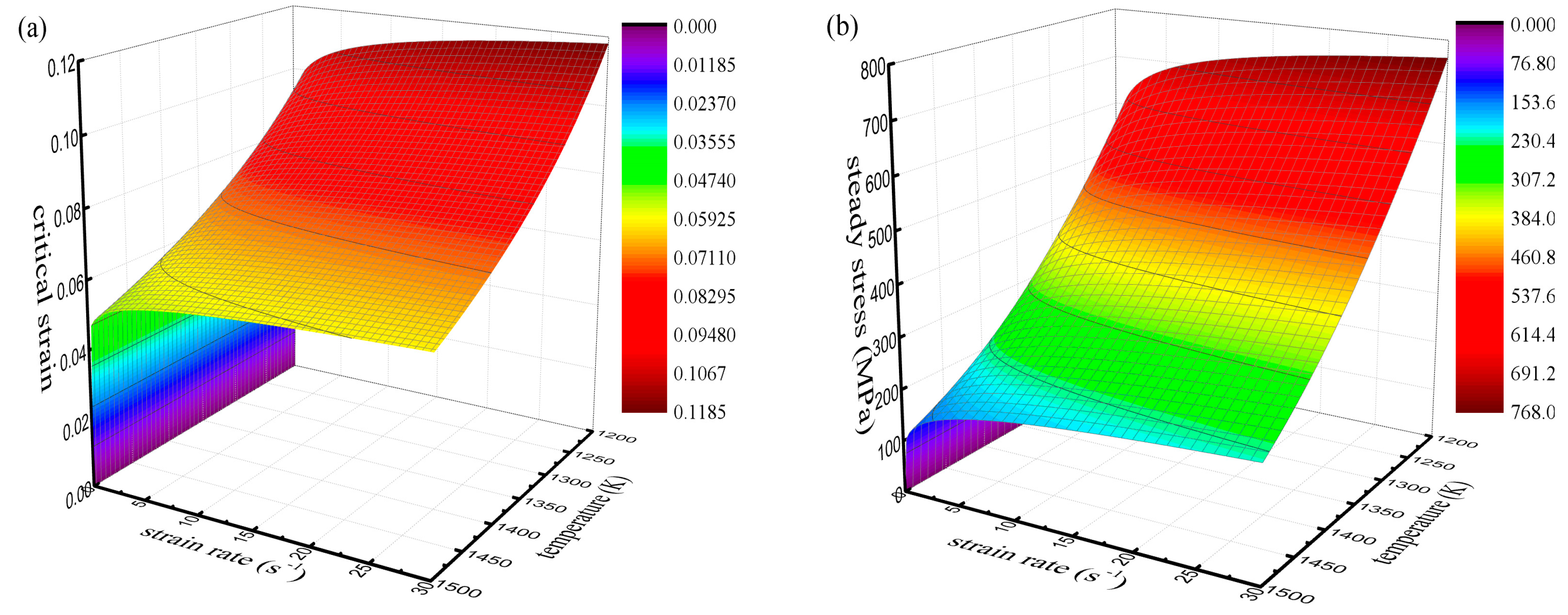 From Equations (16) and (29), we know that the critical strain for recrystallization and the steady state stress are all affected by the deformation temperature and strain rate. Figure 17a,b show how the temperature and strain rate affect the critical strain model and steady stress, model respectively.