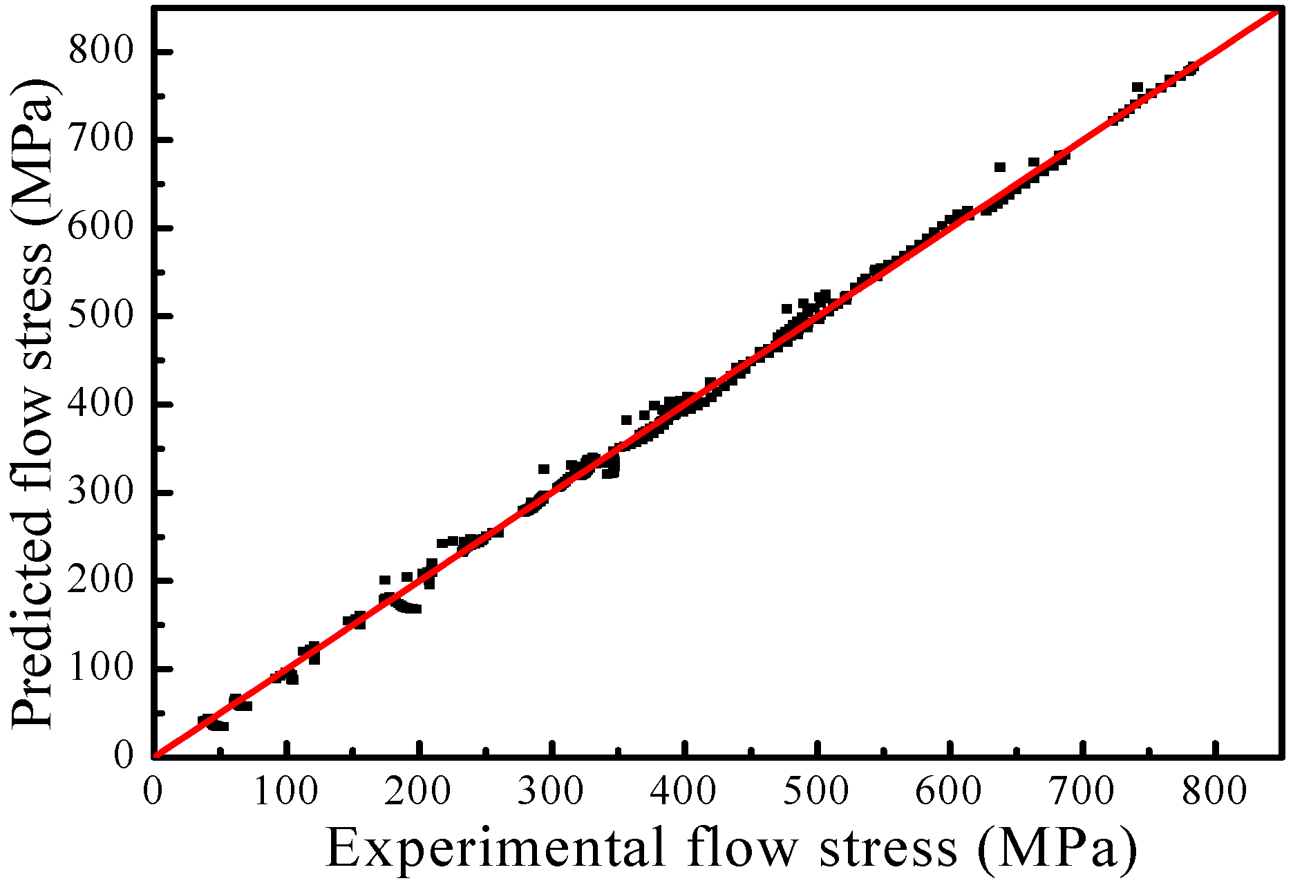 In order to further evaluate the prediction accuracy of the developed constitutive model, the scatter map of the predicted and experimental flow stress data for all the tested conditions are shown in Figure 19. The calculated correlation coefficient (R) is 0.998, which indicates that there is a good correlation between the predicted and experimental data. Meanwhile, the average absolute relative error (AARE) is only 3.58%, which indicates that the developed model has very good prediction capability. Therefore, the developed constitutive model can be used to describe the flow behavior of the nickel-based superalloy under thermal deformation conditions.